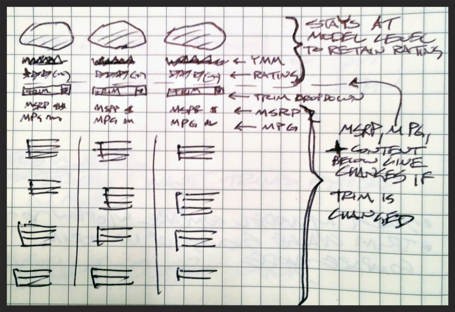I began with an evaluation of our current comparison experience to discover what was working well in addition to its shortcomings. I also looked at the comparison experiences of our competitors, car manufacturers, and experiences outside of the car space, such as eCommerce sites. Additionally, I pulled data from two auto studies to support findings from the comparison evaluations. From these exercises, I developed a set of best practices to follow while developing and sketching ideas.